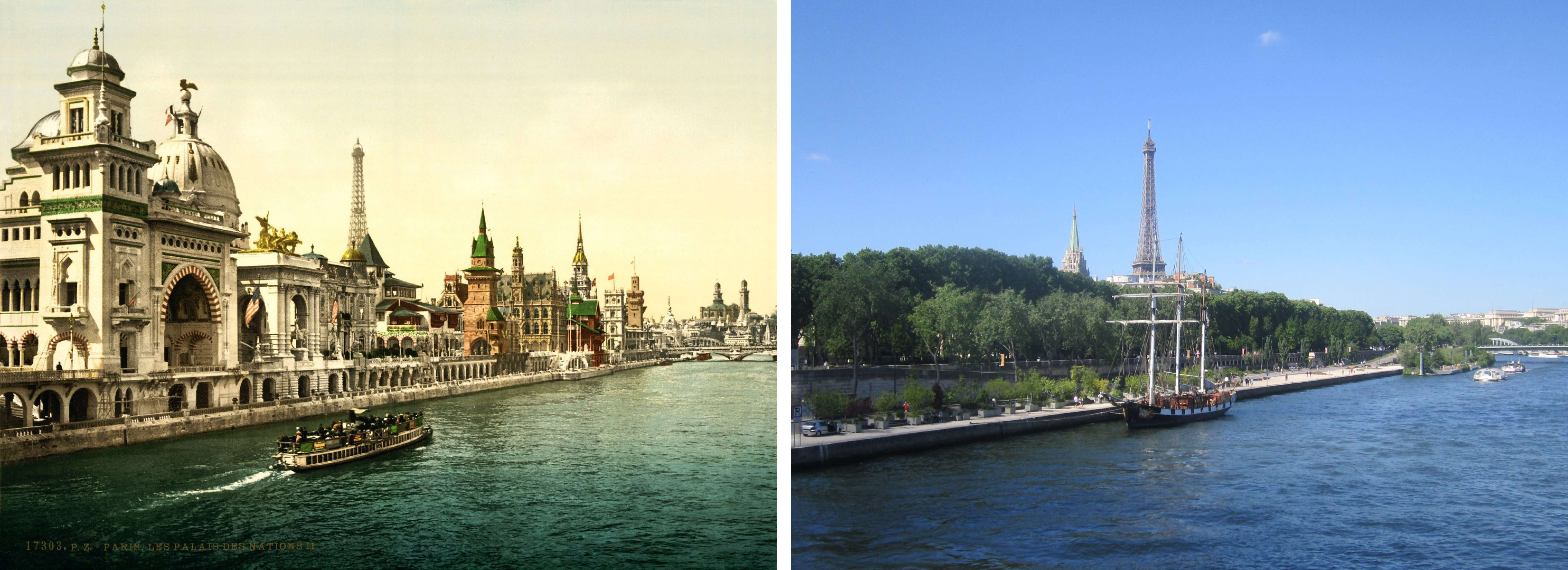 The 1900 Paris Exposition was one of the most successful exhibitions of its kind, attracting more than 48 million visitors. Impressive monuments were erected for this purpose only. On the 'Quai des Nations' (today’s Quai d'Orsay) were found buildings representing the different nations, financed by them. From left to right, the United States, the Ottoman Empire, Bosnia-Herzegovina, Belgium, Germany, Spain and Monaco are represented on this section in the picture. They were all demolished after the exhibition. The Palais du Trocadero, on the other side of the river, was later replaced by the Chaillot Palace, which is still there today. Beside the Eiffel Tower, the only monument remaining in the newer image is the Passerelle Debilly (right), which was also constructed for the visitors of the 1900 Universal Exhibition. The spire next to the Eiffel Tower belongs to the American church, which was erected in 1931.