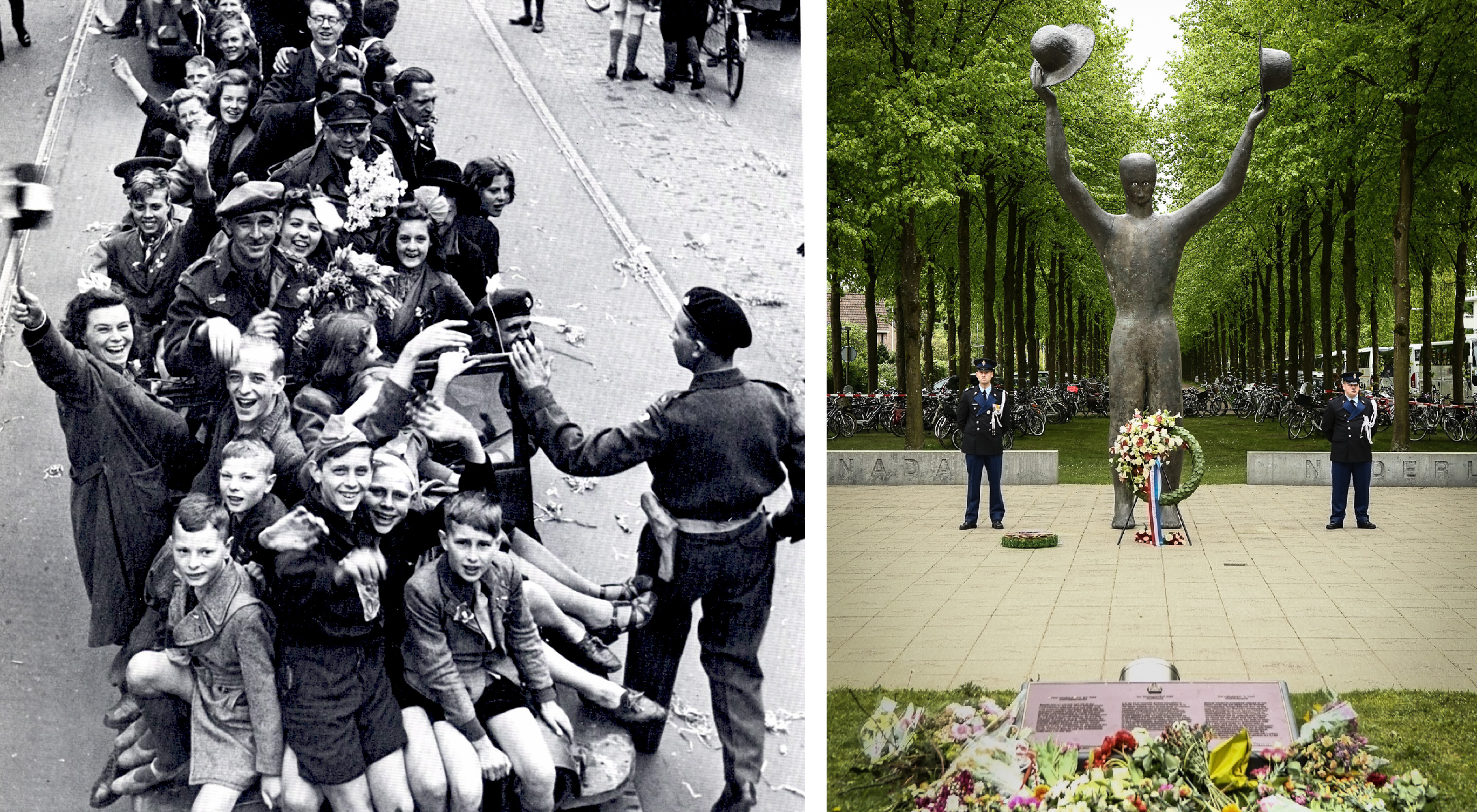 The town of Groningen created a living monument to the Canadian liberators of Holland – a forest of some 30,000 maple trees. The city of Apeldoorn is home to ‘The Man with Two Hats’ – the national Canadian monument. In each hand, the statue holds a hat, symbolizing the duality of war and peace, oppression and freedom, death and life, joy and sadness. An identical statue is located in Ottawa, expressing the bond between Canada and Holland. In fact, since 1953, the Canadian city has held an annual Tulip Festival as a way to remember those who lost their lives in the war, as well as to celebrate the Dutch Princess Juliana’s gift of 100,000 tulip bulbs to Canada for its role in liberating the country and providing refuge for her family.