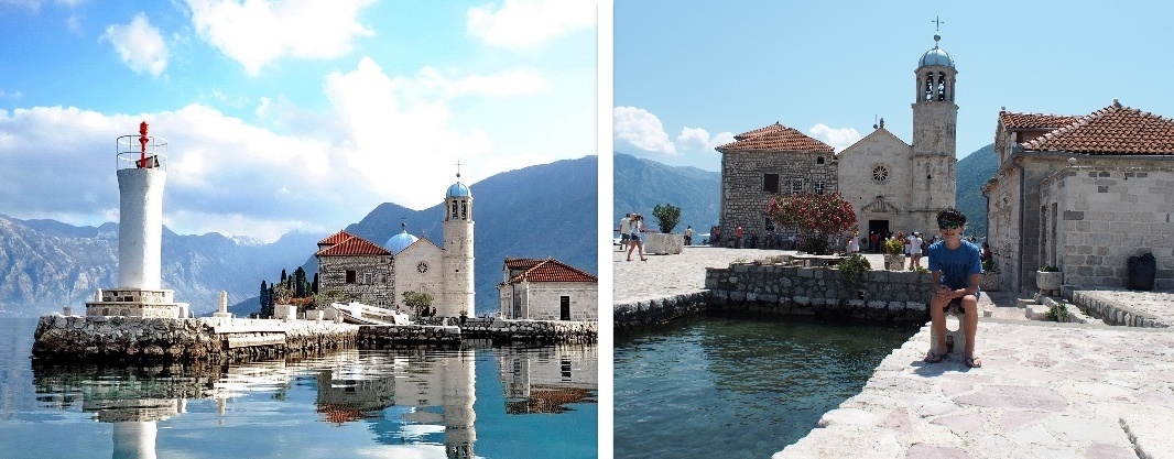 Right: Pedja’s son, Kosta, in front of Our Lady of the Rocks, Montenegro